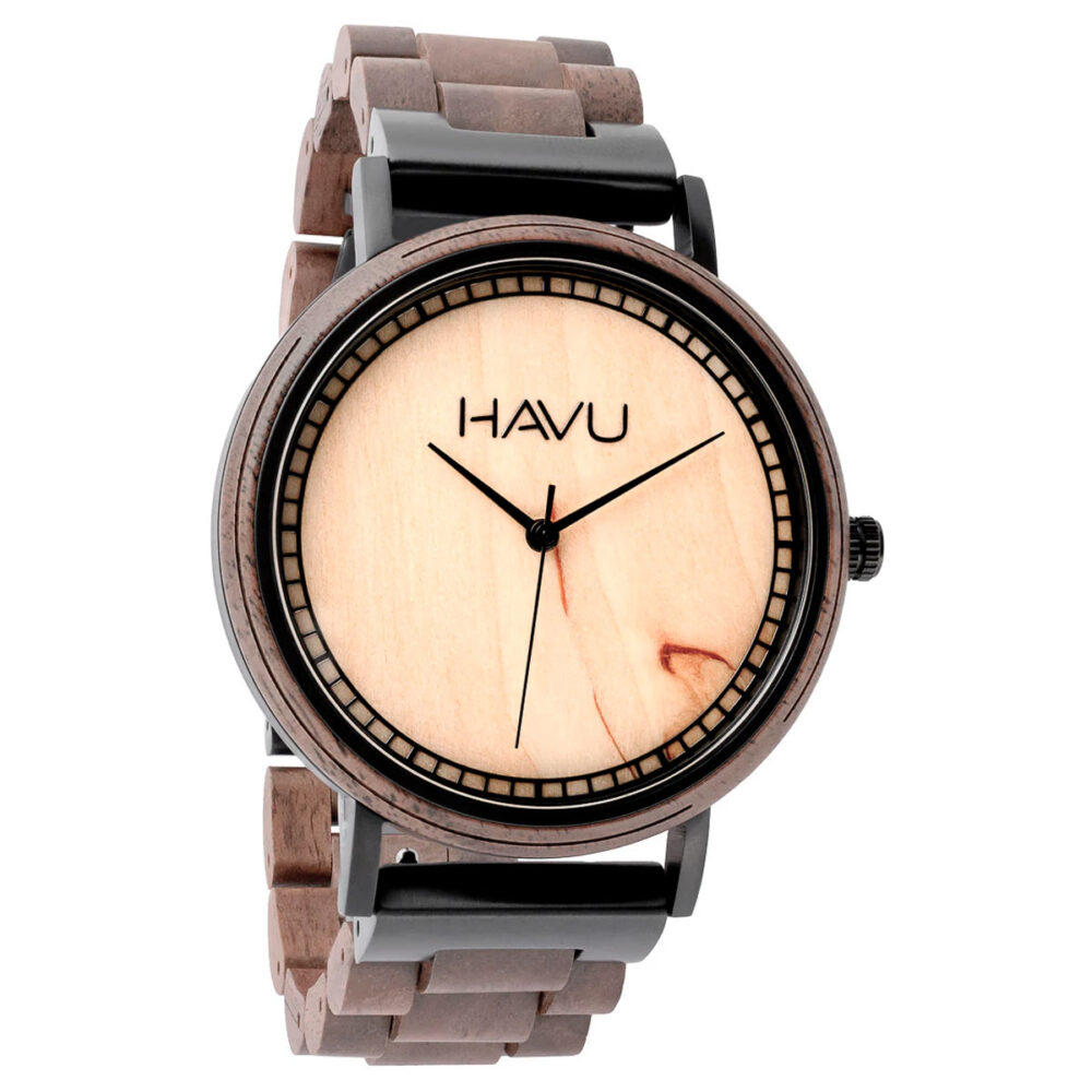 Havu Aava on minimalistinen puinen rannekello, jossa luonnonmateriaalien kauneus pääsee oikeuksiinsa. Kello on valmistettu aidosta pähkinäpuusta ja taulu visakoivusta. Visakoivu on harvinainen puulaji, jonka elävä kuvio tekee jokaisesta kellosta yksilöllisen. Pähkinäpuu puolestaan tunnetaan kestävyydestään ja arvokkaasta ilmeestään.