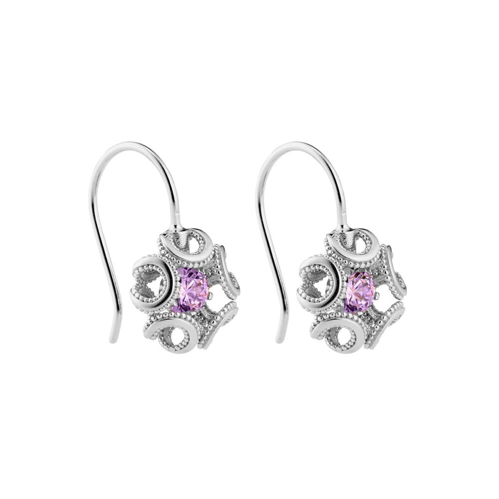 Lumoava Alma korusarja tulkitsee viktoriaanista muotokieltä modernilla tavalla. Korvakorujen pitsimäinen muoto ja kerroksellinen pinta luovat kokonaisuuden, joka on yhtä aikaa herkkä ja ilmeikäs. Keskelle istutetut vaaleanpunaiset kivet tuovat malliin pehmeyttä ja korostavat korun kolmiulotteista rakennetta.